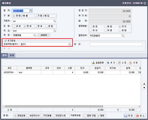 전표 작성시 <ㅁ추가정보>의 프로젝트(범주)에 입력한 범주내용이 표기되어 출력됩니다.