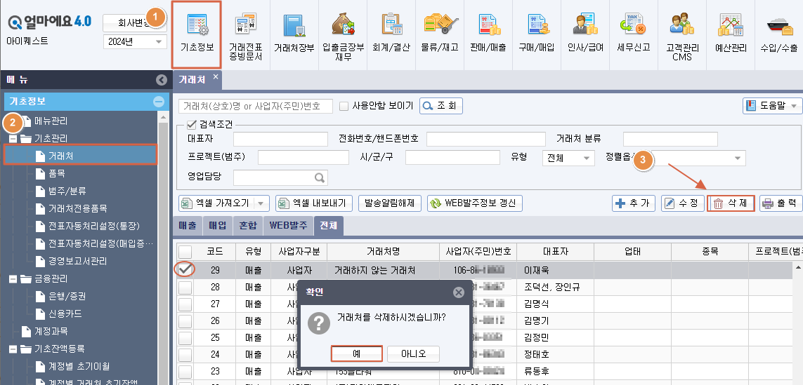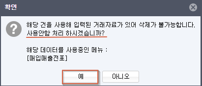 해당 팝업창에서 [예]를 누르면 거래처 목록에서 숨김 처리되어 조회되지 않으며
