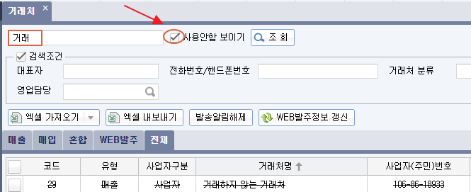 사용 안하는 거래처 사용안함으로 숨김 처리 했다가 다시 조회 원하시는 경우