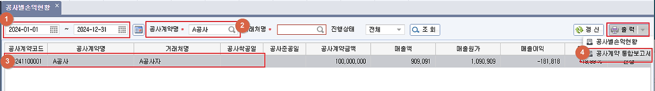 공사별손익현황 에서 조회 하실 기간 지정 후 공사계약명 선택,