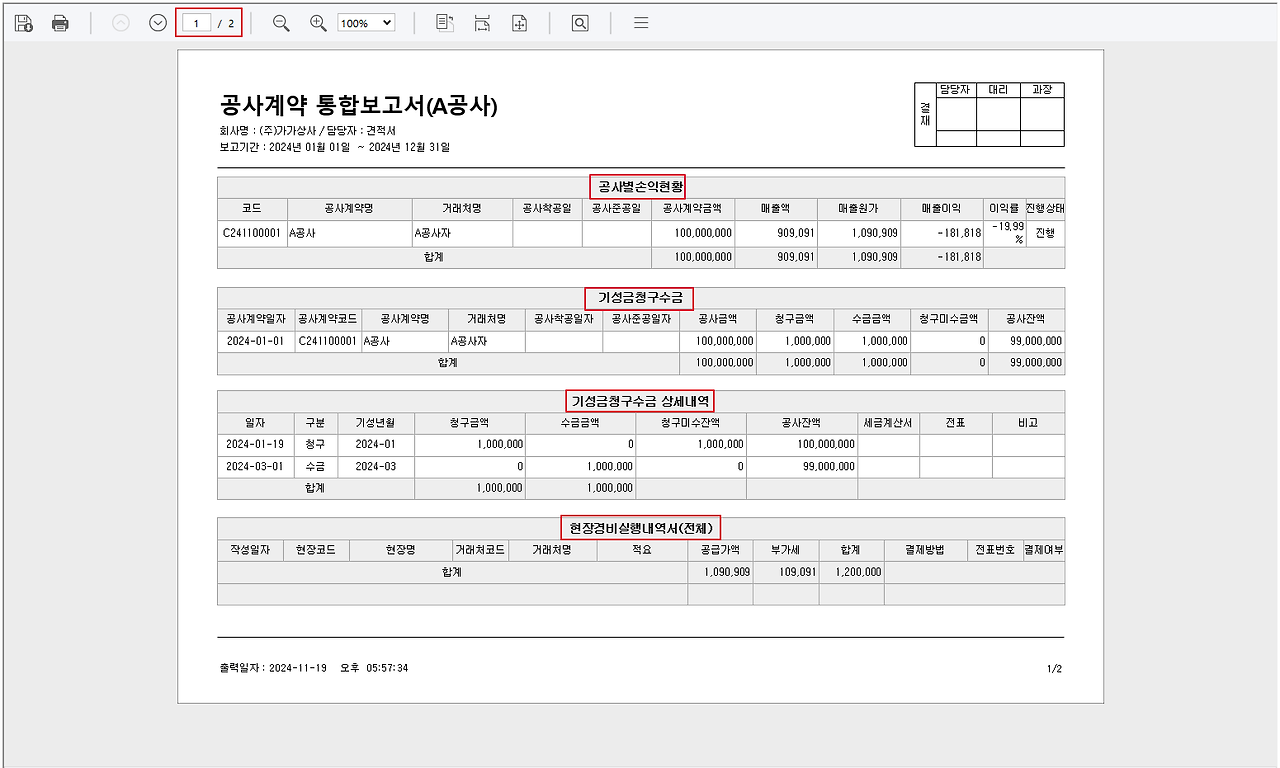 공사계약 통합 보고서는 해당 공사계약건의 공사별 손익현황, 기성금청구수금 상세내역,