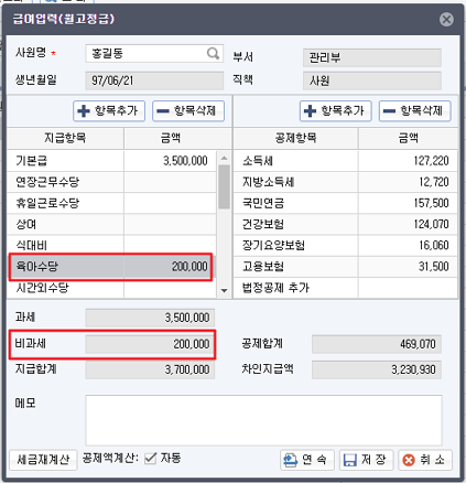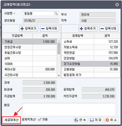[세금재계산]을 클릭하면 공제금액이 다시 계산이 됩니다.