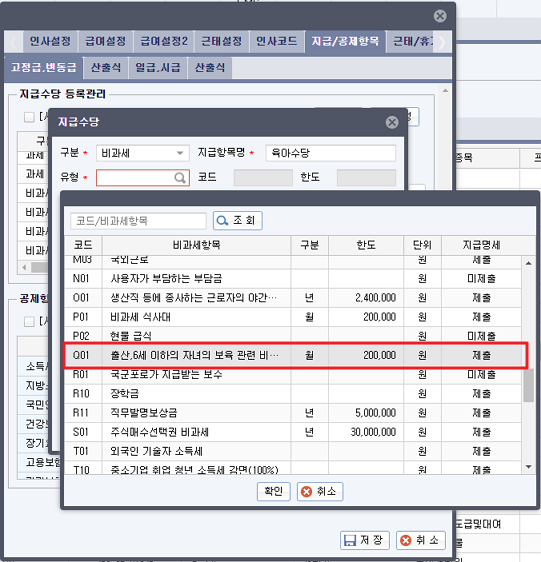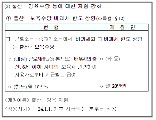 ※ 귀속연월 2024년도 1월부터 출산, 6세 이하 자녀 보육수당 비과세 한도가 20만원으로 상향되었습니다.
