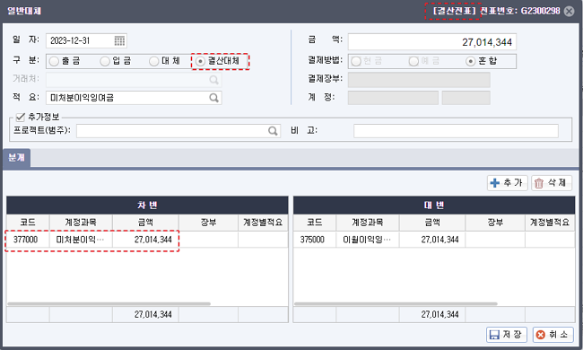 [대체분개를 일반전표에 추가하시겠습니까?] 확인 창에서 [예]를 선택합니다.