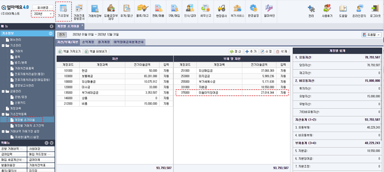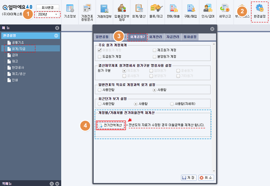 2024년 회기에서 [전기잔액계산]을 실행하여 기존에 입력된 계정별 초기잔액을 다시 계산합니다.