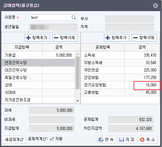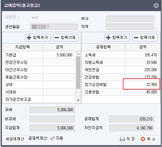[인사/급여] - [급여입력] 시 설정에 따라 장기요양보험료가 계산됩니다.