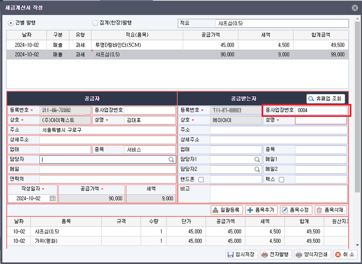 ※ 숫자 4자리 형식으로 입력하지 않으시면 [전자발행] 후 홈택스에서 발행내역 확인 시 종사업자번호는 확인되지 않습니다.