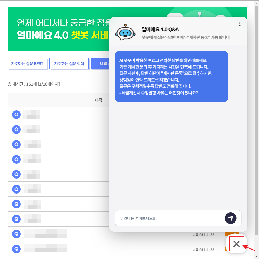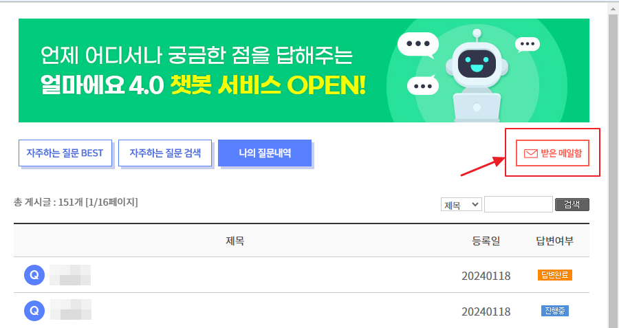 [받은메일함]은 [온라인문의] - 챗봇질문창을 [X]버튼을 이용하여 닫으면 확인하실 수 있습니다.