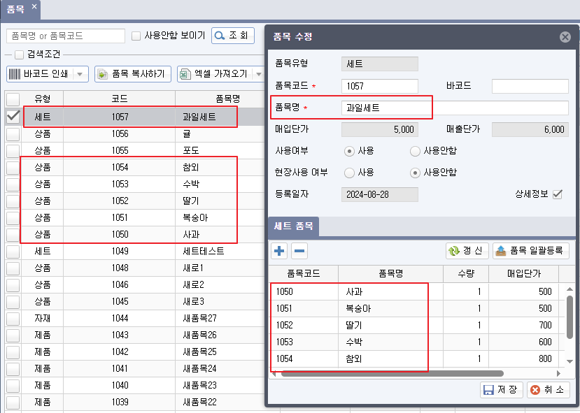 [기초정보] - [품목] - [세트]에 품목이 등록되어있는 상태에서