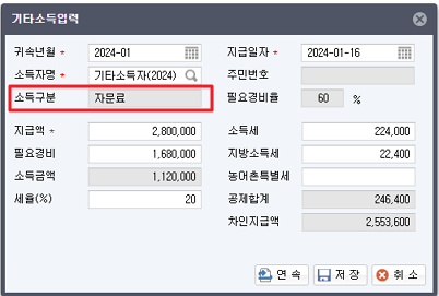 ※ 2024년 1월 1일 이후에 지급하는 기타소득 중 소득구분 76,79번 항목에 대해 원천세 인적용역으로 집계되도록 수정되었습니다.