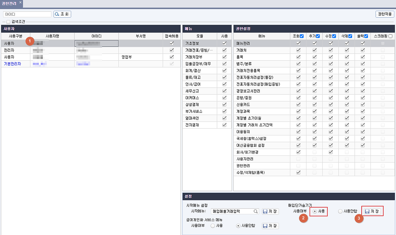 [기초정보][권한관리] 에서 유저아이디 매입단가 숨기기 설정하실 수 있습니다.