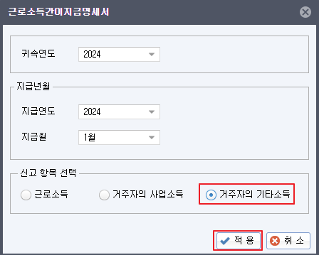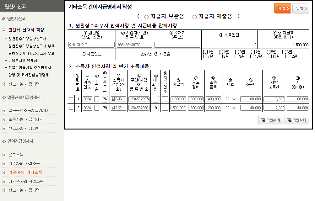 ※ 2024년 1월 1일 이후에 지급하는 기타소득 중 소득구분 76,79번 항목에 대해 인적용역 기타소득 간이지급명세서 작성되도록 기능이 추가되었습니다.