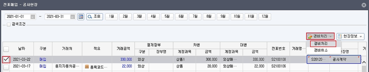 현장정보가 등록된 매입내역을 선택하여 [경비처리]-[경비처리] 를 클릭하여