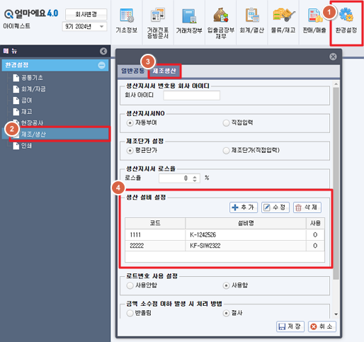 [환경설정]-[제조/생산]-[제조생산]의 <생산 설비 설정>에서 생산설비를 추가,수정,삭제할 수 있습니다.