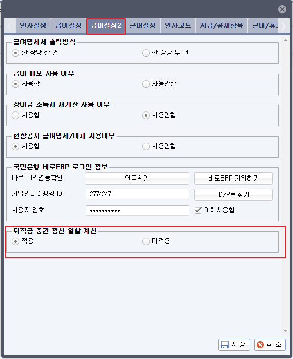 [퇴직금 중간 정산 일할 계산] 을 적용/미적용 할 지 선택 하여 설정저장 할 수 있습니다.