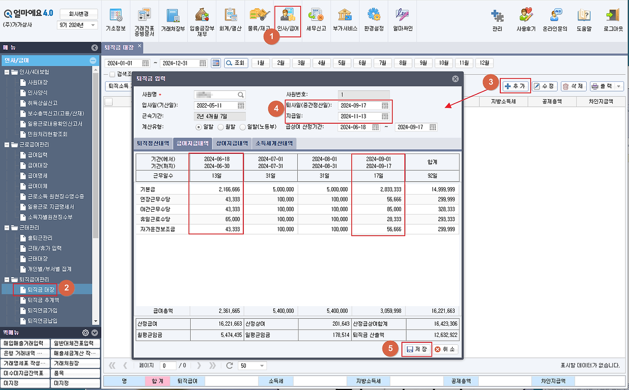 [추가] 버튼 클릭 후 퇴사일(중간정산일), 지급일 기재 하시고 저장 하시면 [급여 지급내역] 에서 중간정산일에 맞게 일할 계산 되는 점 확인 하실 수 있습니다.