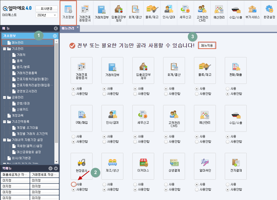 [기초정보]> [메뉴관리]를 누르면 프로그램에서 사용할 수 있는 모든 메뉴를 확인 하실 수 있습니다.