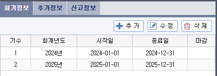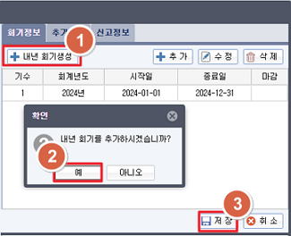 [기초정보]-[회사/회기변경]의 [회기정보]탭에서 [내년 회기생성]버튼을 클릭하시면