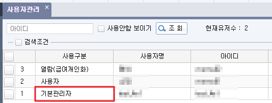 [기초정보]-[사용자관리]에서 <사용구분-기본관리자>로 되어있는 아이디로 접속하여