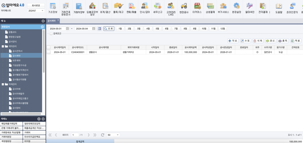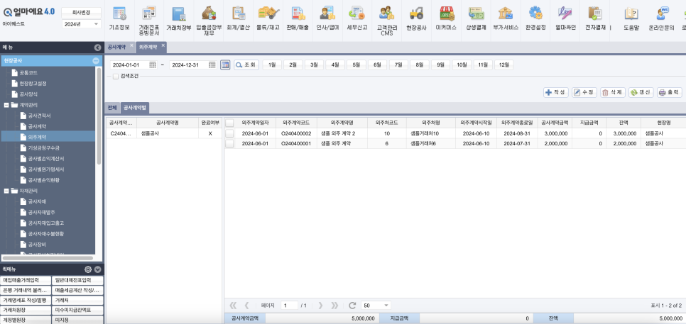 아이퀘스트의 건설업 특화 ERP [얼마에요]에서는 공사계약서와 외주 공사계약서를 모두 등록하여, 전체 공사 현황과 외주 공사 현황을 비교하며 관리할 수 있습니다.