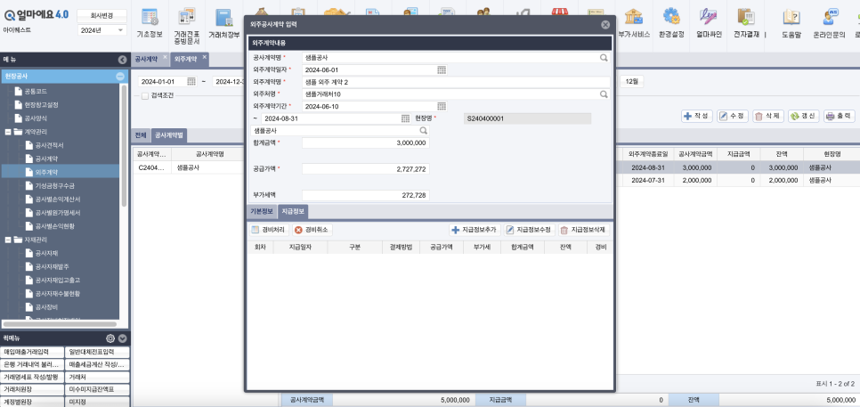 또한 외주 공사계약서를 등록할 때 기본적인 공사 계약 내용과 지급 정보를 등록할 수 있습니다.