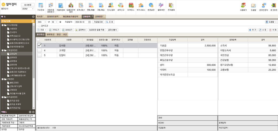 [AI얼마경리]에서는 임직원의 개인 정보와 상세한 급여 정보, 사업 지출 내역를 입력하면 4대 보험과 원천세 등 세금 내역을 자동으로 계산합니다.