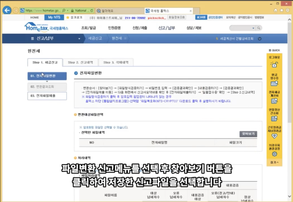 생성된 홈택스 신고자료는 원천세 신고 과정에서 홈택스 ‘전자파일변환'에 등록하여 활용할 수 있습니다. 신고자료를 등록한 후 변환 파일 형식과 내용을 검증을 완료하면 별다른 정보 입력 없이 원천세 신고에 적용할 수 있습니다.