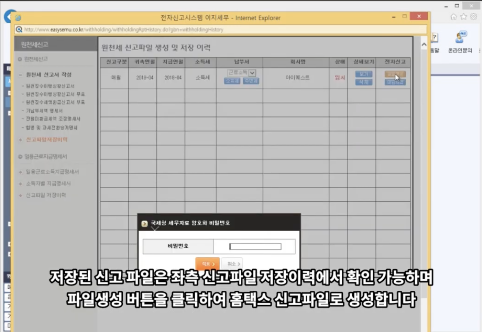 저장된 신고 파일은 [얼마에요 ERP] 클라우드 서버에 저장되며 파일생성 버튼을 클릭하면 홈택스 신고자료로 빠르게 생성할 수 있습니다.