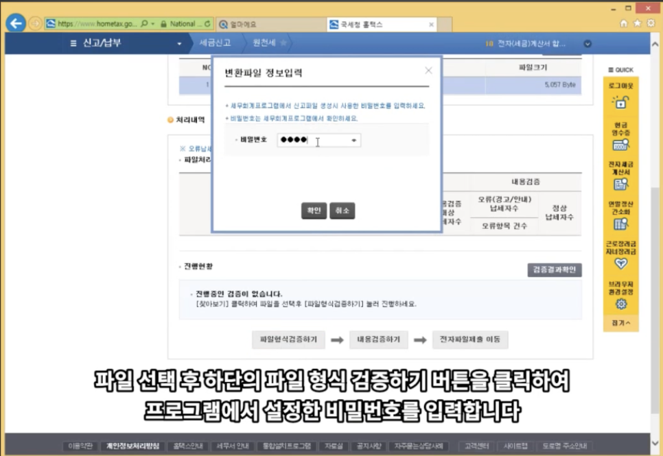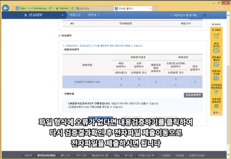 생성된 홈택스 신고자료는 원천세 신고 과정에서 홈택스 ‘전자파일변환'에 등록하여 활용할 수 있습니다. 신고자료를 등록한 후 변환 파일 형식과 내용을 검증을 완료하면 별다른 정보 입력 없이 원천세 신고에 적용할 수 있습니다.