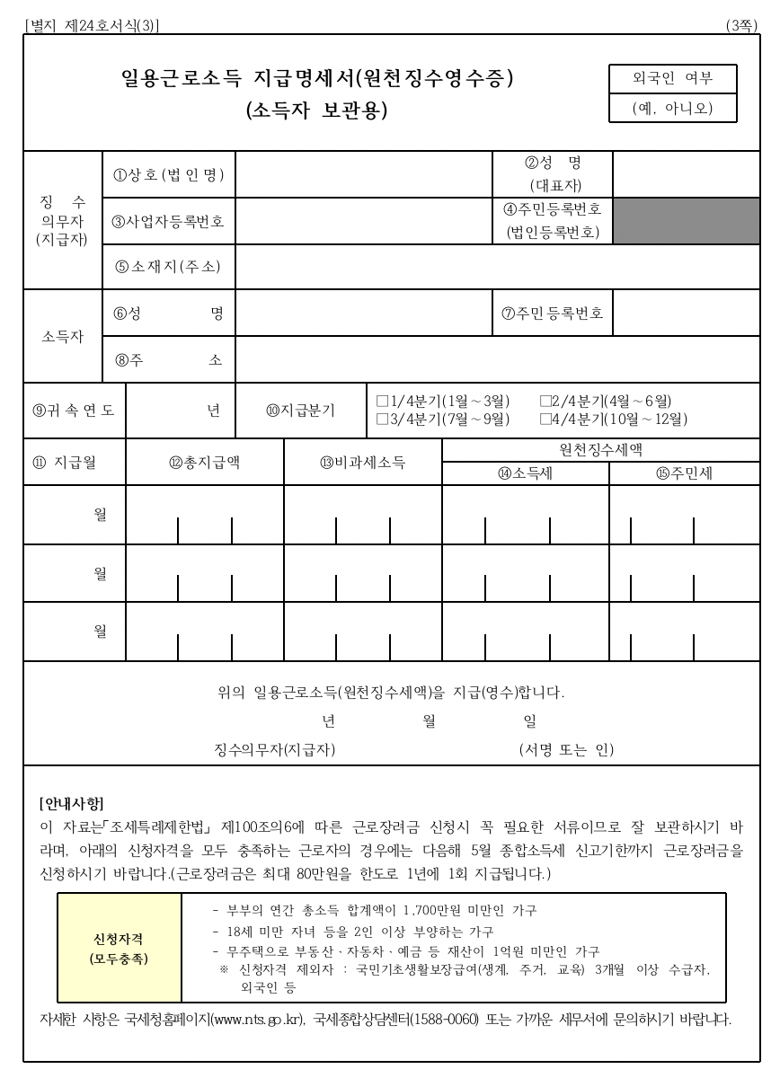 위 양식은 법제처에서 제공하는 ‘일용근로소득 지급명세서' 양식입니다. 일용직 근로자에게 급여(인건비)를 지급할 때 위와 같은 양식으로 지급명세서를 발급해야 합니다.