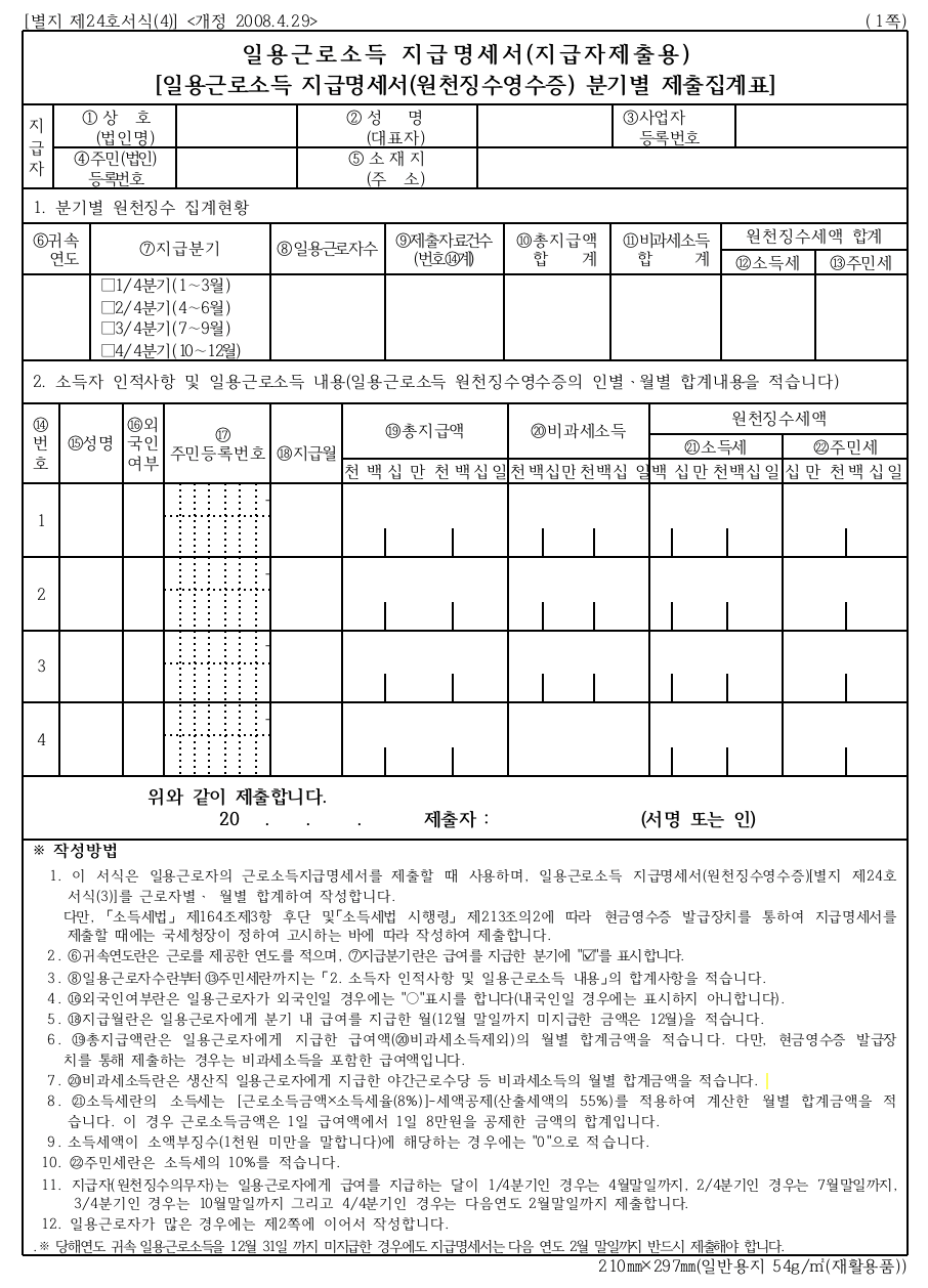 해당 분기에 고용한 일용직 근로자 수와 근로자들의 정보, 급여액, 세액을 모두 기입하고, 일용직 급여 신고 시 본 명세서를 증빙자료로 활용하시기를 바랍니다.