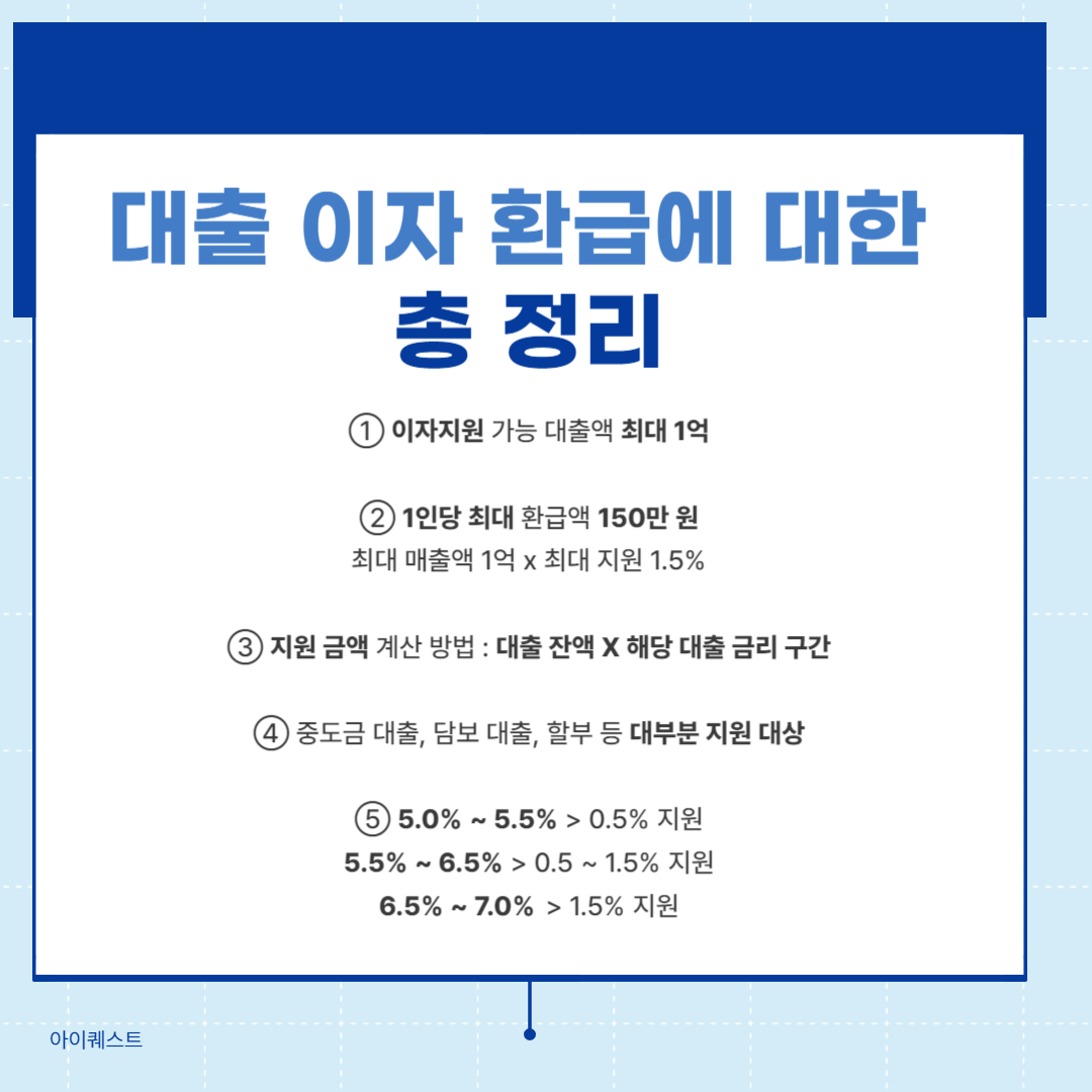 이에 따라 신청자의 대출 금리가 5.0% 이상 5.5% 미만인 경우에는 대출 잔액*0.5%를 지원받으며, 대출 금리가 6.5% 이상 7.0% 미만인 경우에는 대출 잔액*1.5%를 지원받게 됩니다. 이자 지원이 가능한 대출액은 최대 1억 원이며 최대 지원 금리가 1.5%이므로, 신청 1인당 최대 150만 원의 이자비용을 환급받을 수 있습니다.