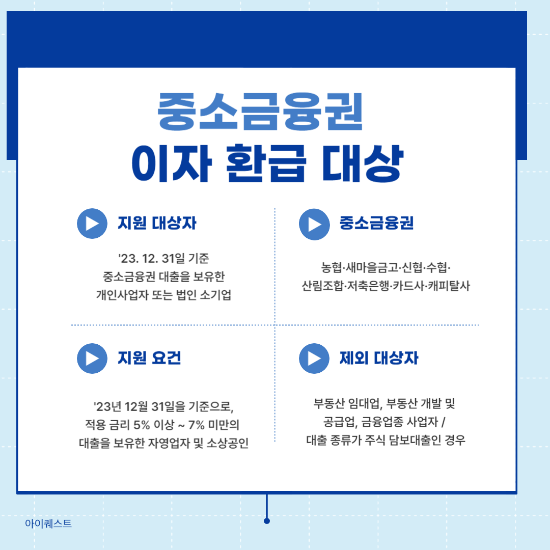 중소금융권 대출 이자 지원 대상자는 '23년 12월 31일을 기준으로 하여 판단합니다. 해당 일자를 기준으로 개인사업자 또는 법인 소기업이면서, 중소금융권에서 금리 5~7%로 받은 대출이 있는 경우에는 이자 비용을 1인 최대 150만 원까지 지원받을 수 있습니다. 특히 중도금 대출이나 마이너스 대출, 할부 등 대부분의 대출에 대한 지원이 가능하기 때문에, 반드시 지원 여부를 확인하여 환급을 신청해 보시기 바랍니다.