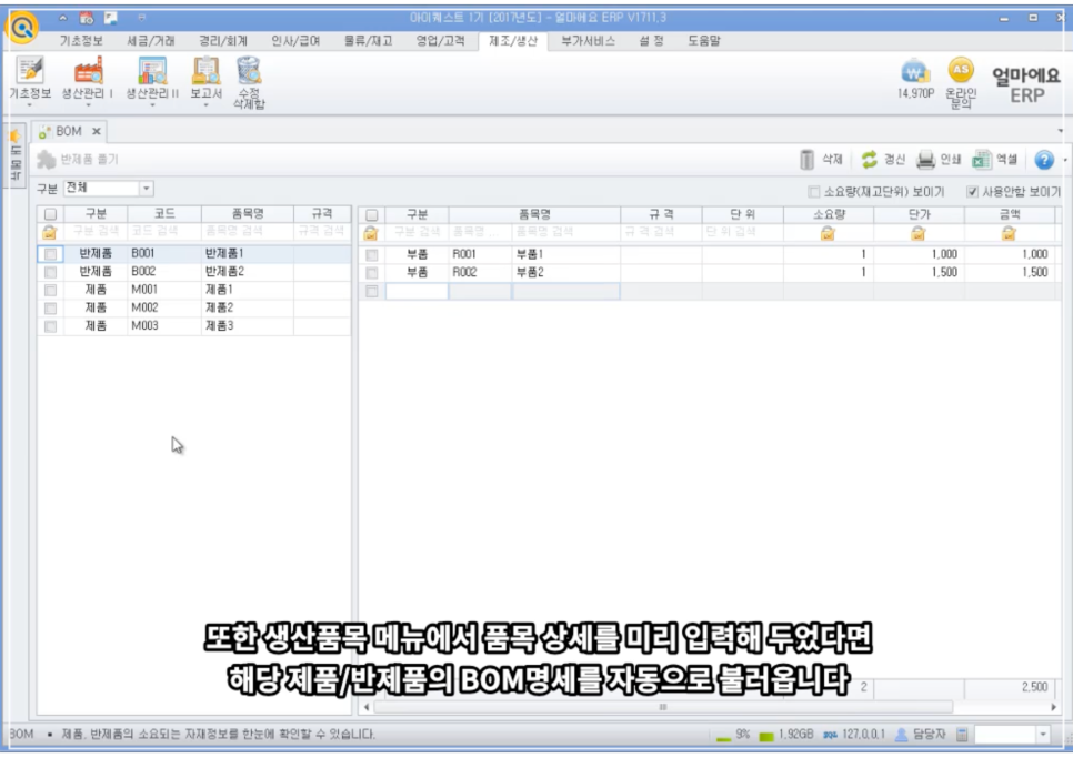 자재명세서를 등록하면 제품 및 반제품 생산 시 소요되는 부품별 소요량을 등록하여, 제조/생산 시 제품별 소요 품목을 자동으로 불러올 수 있습니다.