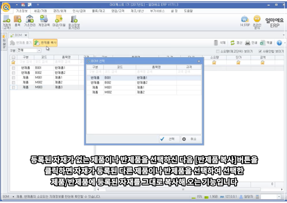 또한 다른 제품에 등록된 BOM 내역을 그대로 복사할 수 있고, 부품의 매입단가 변동 시 자재명세서 단가를 자동으로 갱신할 수 있습니다.