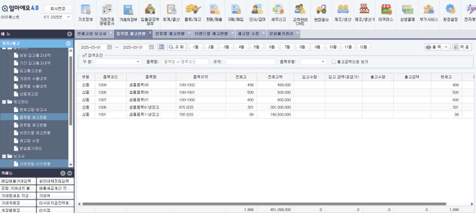 - 재고 현황 파악 : ‘현재고량 보고서’뿐만 아니라 ‘품목별 재고현황’ ‘브랜드별 재고현황’ ‘창고별 재고현황’ 등의 기능을 제공하여 원하는 데이터를 빠르게 확인할 수 있습니다.