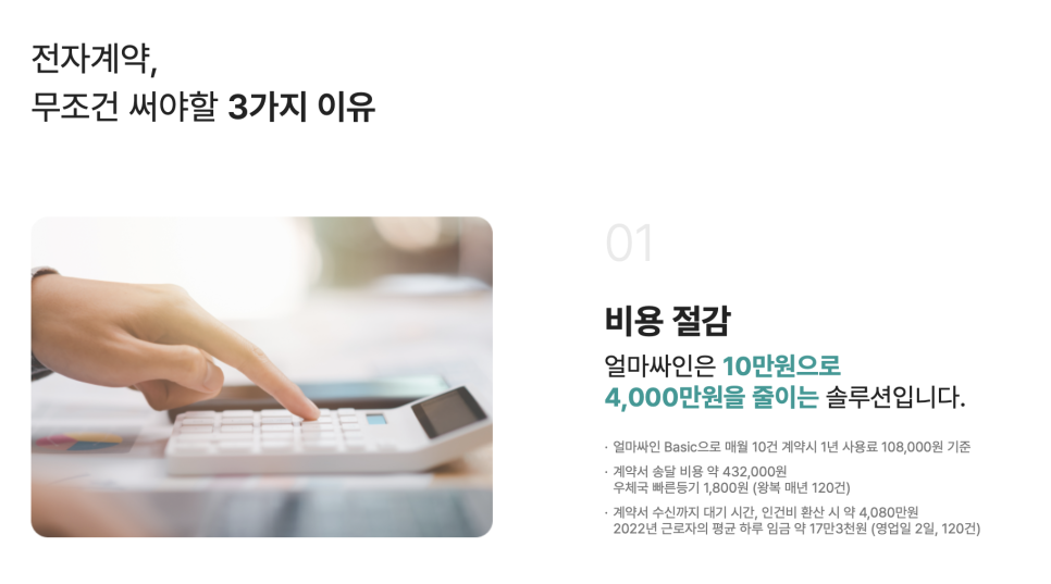 지금 바로 [얼마싸인]으로 여러분의 기업의 업무 비용과 시간을 절약하고 생산성을 높여 새로운 성장 모멘텀을 만들어 보세요.