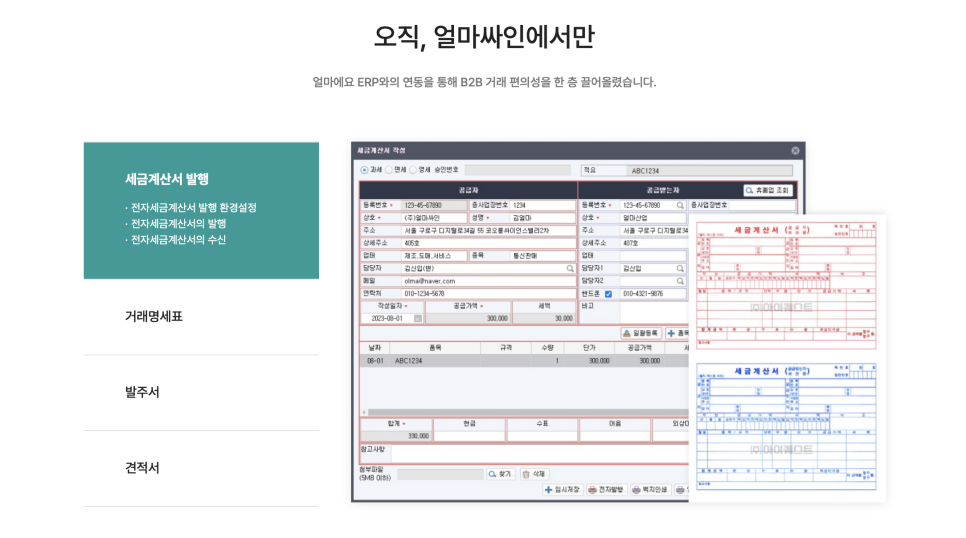 또한 [얼마에요 ERP]와의 연동으로 B2B 거래 편의성을 크게 향상했는데요, 거래처와 주고받는 증빙서류 업무에도 [얼마싸인]을 사용할 수 있습니다.
