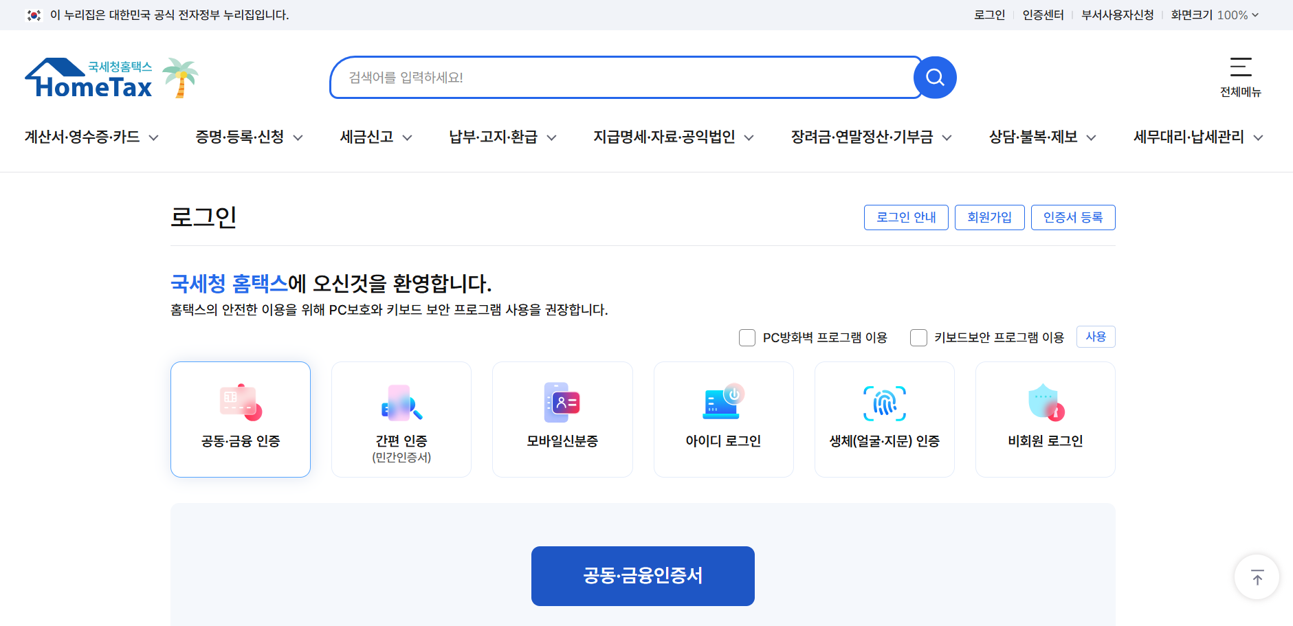 2 공동인증서, 민간인증서, 사업자 아이디, 개인 아이디 등을 이용해 로그인 하기
