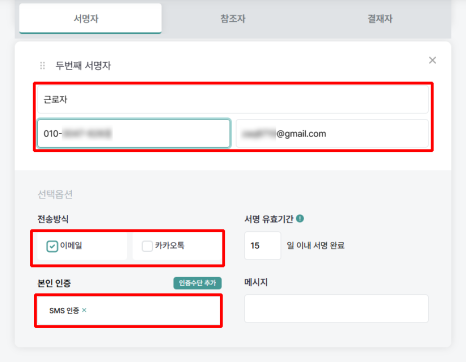 STEP 04. 서명자 정보 기입 (각 서명자의 전화번호, 메일 주소, 전송방식, 본인인증 방식 선택)