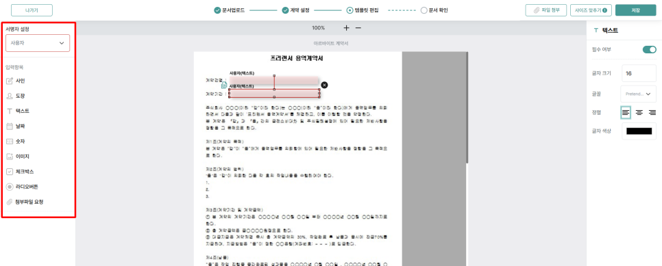 STEP 05. 입력항목 설정 : 각 서명자 별로 기재, 서명해야 할 부분에 ‘텍스트’ ‘서명’ 등 항목 추가