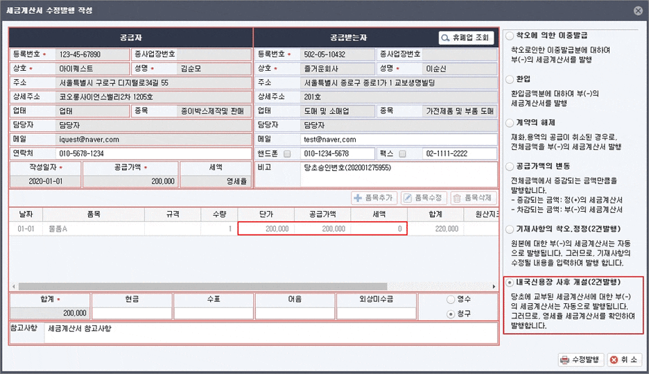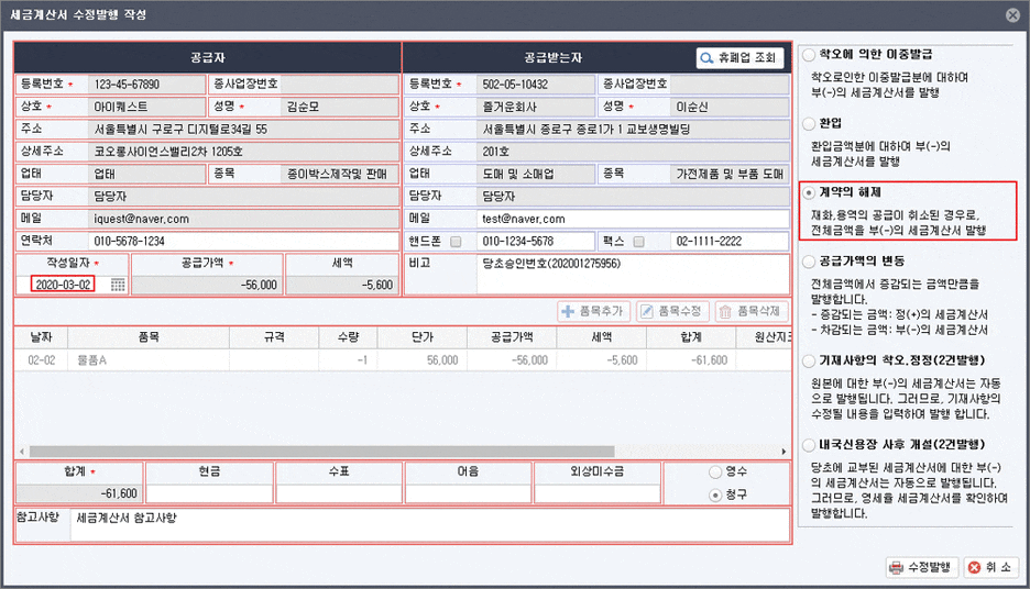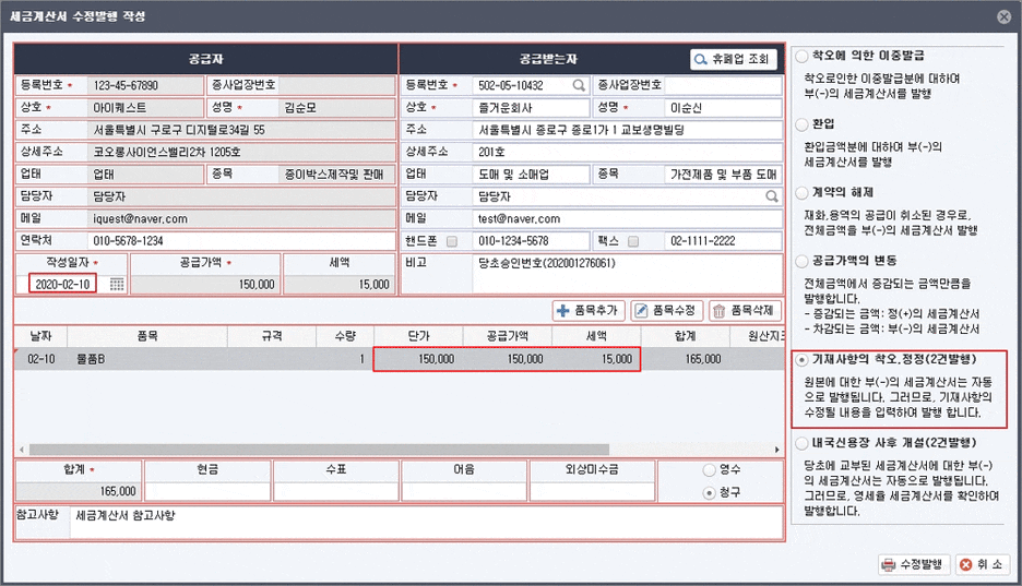 1) 세금계산서 항목을 잘못 썼을 때