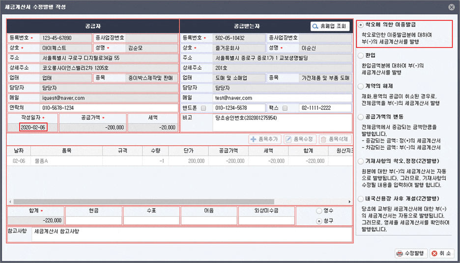 이 경우에는 ‘착오에 의한 이중 발급’ 사유에 속합니다. 기존에 잘못 작성한 건에 대해 마이너스 수정 세금계산서 1장을 발행하면 됩니다.
