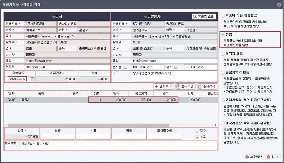 마지막으로 반품 요청이 들어왔을 때도 수정 세금계산서를 발행해야 해요. 이때는 ‘환입' 사유로 수정 세금계산서를 발행하면 됩니다.