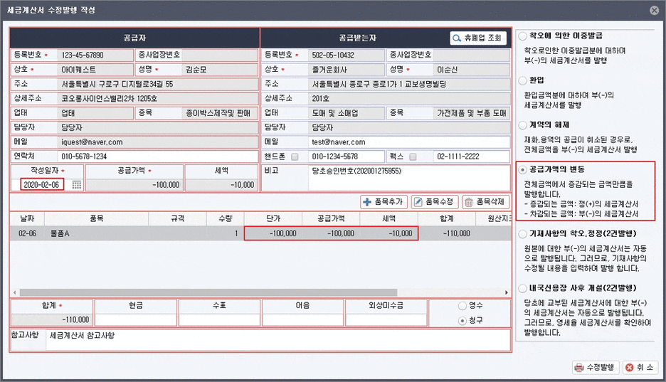 작성일자는 변동 사유가 생긴 날짜를 적고, 해당 수정계산서는 변동 사유 발생일 다음 달 10일까지 발행해야 합니다.