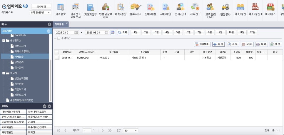 생산 완료된 자재 불출 내역을 확인하고 관리할 수 있는 기능입니다. 자동 불출된 경우, 생산관리에서 즉시 조회할 수 있으며 생산량만 입력하면 됩니다.