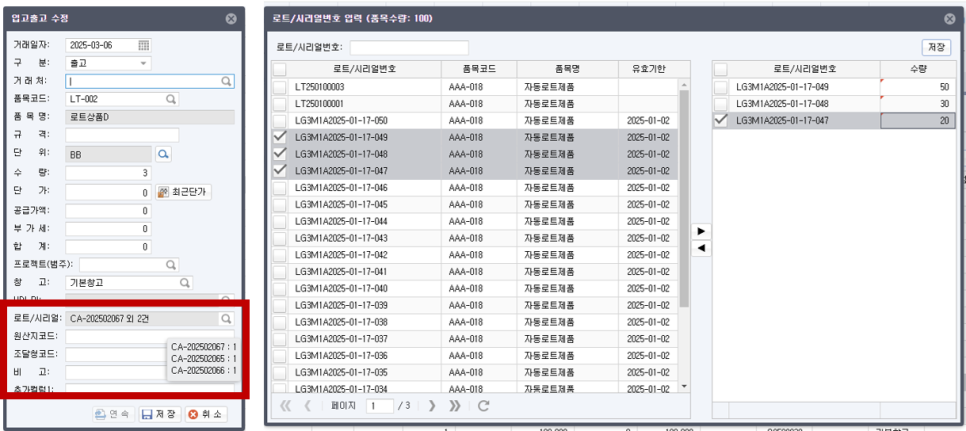 공통 품목 입력 시, 로트/시리얼번호 입력을 할 수 있어요!