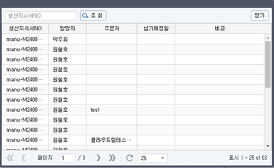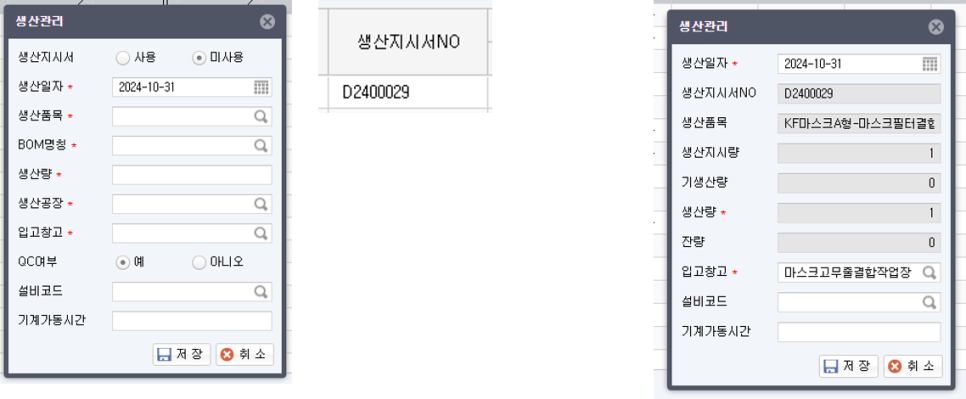 - 저장 시에 생산지시서NO가 D로 시작하는 생산지시서로 자동 생성되며, 생산지시서에서는 조회되지 않습니다.생산지시서 자동 생성 시 생산지시량은 생산량과 동일한 값으로 저장됩니다. 수정 시에는 생산량을 변경할 수 없습니다.