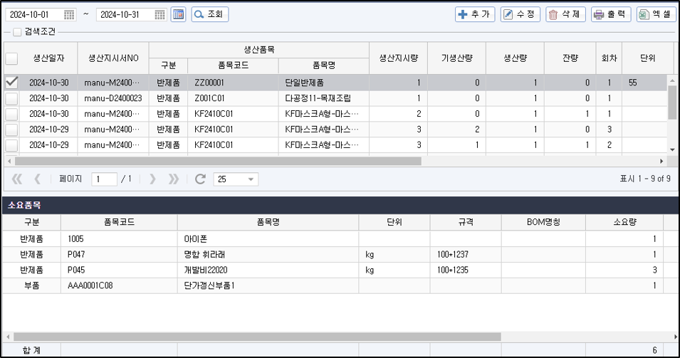 - 생산관리2(자재불출)에서 생산지시를 작성하는 경우 : 소요부품에 대한 생산출고 처리를 진행한 뒤, 생산품목에 대한 생산입고를 처리합니다.