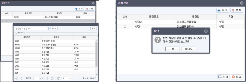 공정관리 팝업에서 공정을 저장하는 경우, 추가되어 저장된 공정수는 줄일 수가 없다는 알림창이 뜹니다. 공정관리에서 공정 등록 시 해당 공정에서 생성되어야 하는 제공품(반제품)의 정보를 기초정보 품목에 등록하고 가장 마지막 순서의 처리 시 좌측 그리드의 생산품목을 생산하도록 처리되어 있기 때문에, 기존 공정순서를 추가로 늘리는 것은 가능하나 줄이는 것은 불가능한 점 참고 바랍니다.